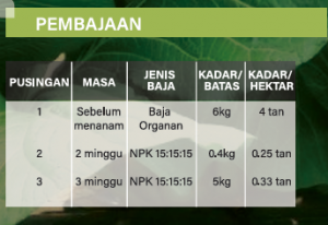 | Organik (Tahi ayam) | 5 | -7* (Sebelum Tanam) | Tabur atas tanah dan gaul dalam tanah. | |